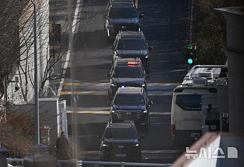 정부과천종합청사로 이송…곧 조사 시작[서울=뉴시스] 황준선 기자 = 고위공직자범죄수사처와 경찰에 의해 체포된 윤석열 대통령이 탑승한 차량이 15일 서울 용산구 윤석열 대통령 관저를 나서고 있다. 2025.01.15. hwang@newsis.com