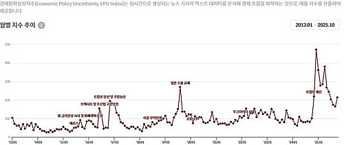 EPU는 언론 보도 등을 바탕으로 경제 정책의 불확실성을 실시간 계량화한 지표다. 통상 정치적 혼란과 정책 불투명성, 대외 불확실성 등이 겹칠 때 수치가 높아진다.