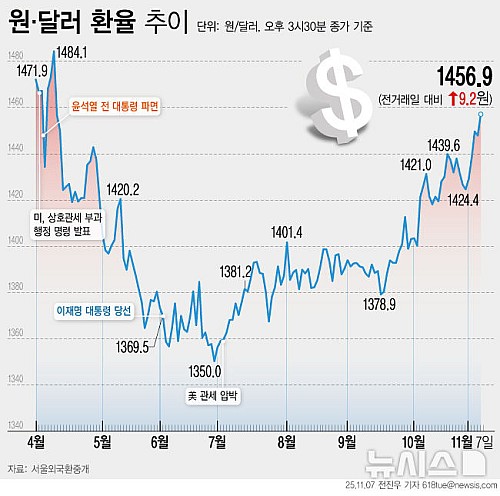 [서울=뉴시스] 7일 서울 외환시장에 따르면 이날 원·달러 환율은 전 거래일(1447.7원)보다 9.2원 오른 1456.9원에 마감했다. (그래픽=전진우 기자) 618tue@newsis.com