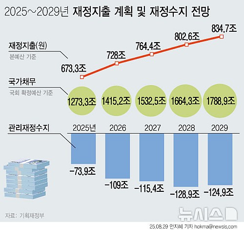[서울=뉴시스] 이재명 정부가 확장 재정 기조로 경제정책의 방향을 설정함에 따라 향후 5년간 재정지출은 연평균 5.5%씩 증가할 전망이다. 내년 관리재정수지 적자 규모는 국내총생산(GDP)의 4.0%에 달하는 109조원까지 확대될 전망이다. 국가채무는 1415조2000억원으로 GDP 대비 51.6%까지 상승한다. (그래픽=안지혜 기자) hokma@newsis.com