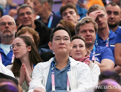 2년 만의 스포츠 외교 활동[파리=뉴시스] 김진아 기자 = 이재용 삼성전자 회장이 27일(현지시간) 프랑스 파리 그랑 팔레에서 열린 파리 올림픽 펜싱 남자 사브르 개인 경기를 관람하고 있다. 2024.07.28. bluesoda@newsis.com