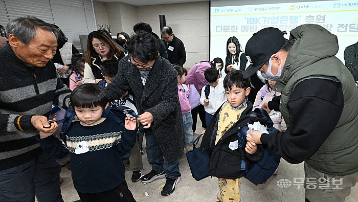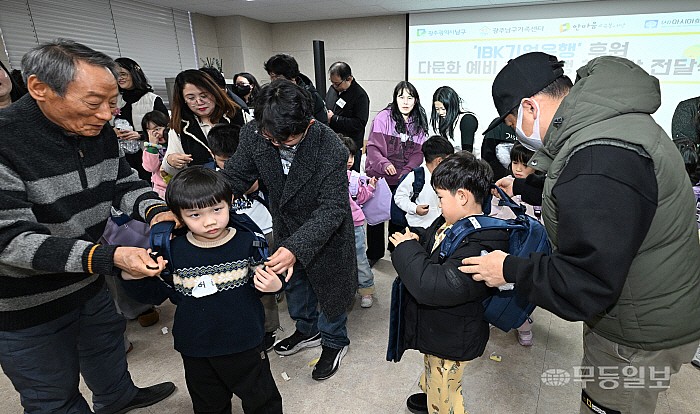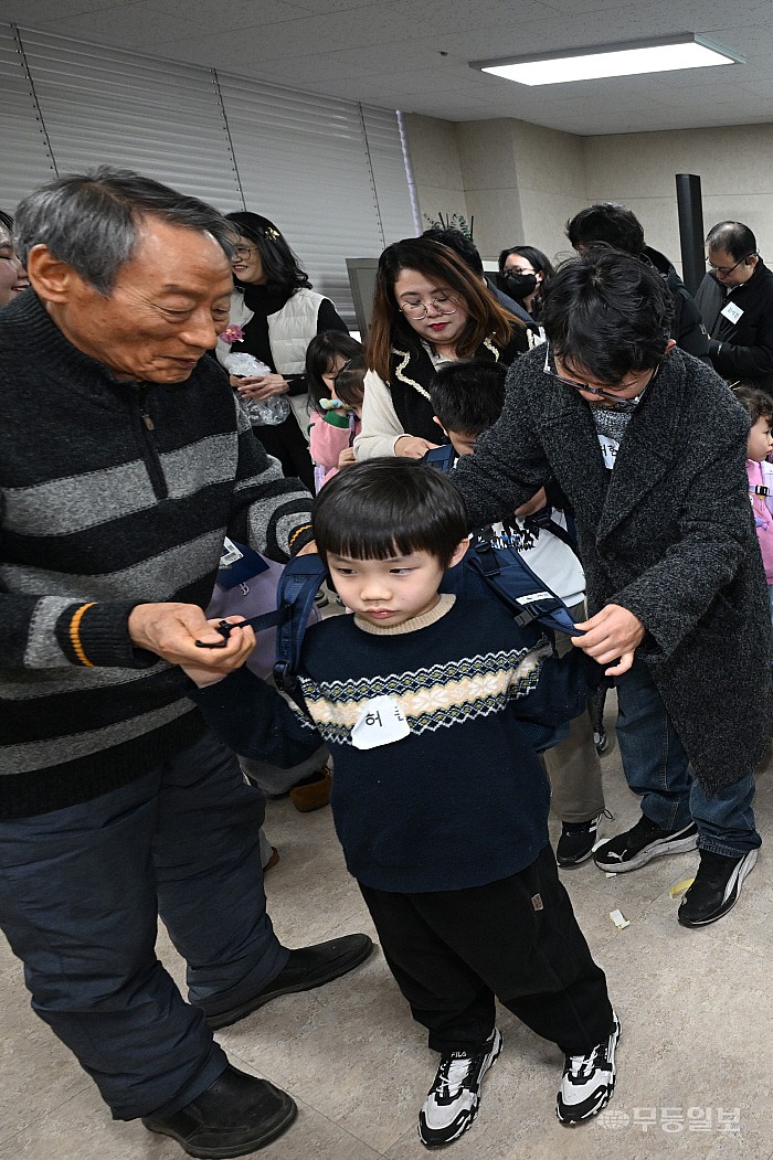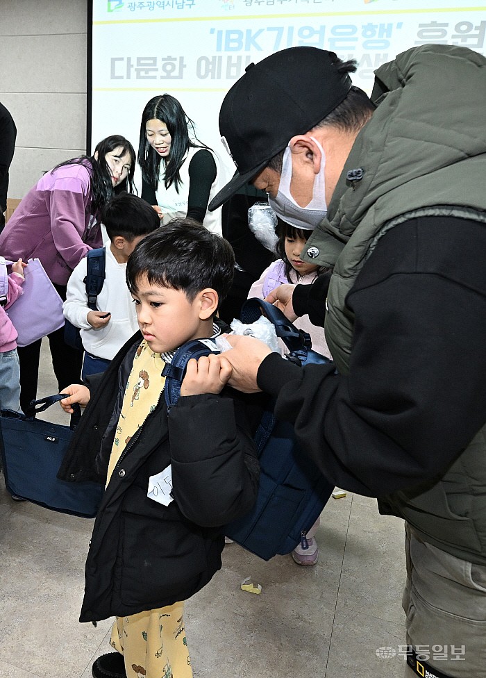 다문화 예비학부모 대상으로 자녀언어발달교육 및 책가방 전달식이 열린 7일 광주 남구 가족사랑나눔 및 지역자활센터 게이트웨이 교육장에서 학부모들이 초등 입학 자녀들에게 책가방을 어깨에 걸쳐 주고 있다.